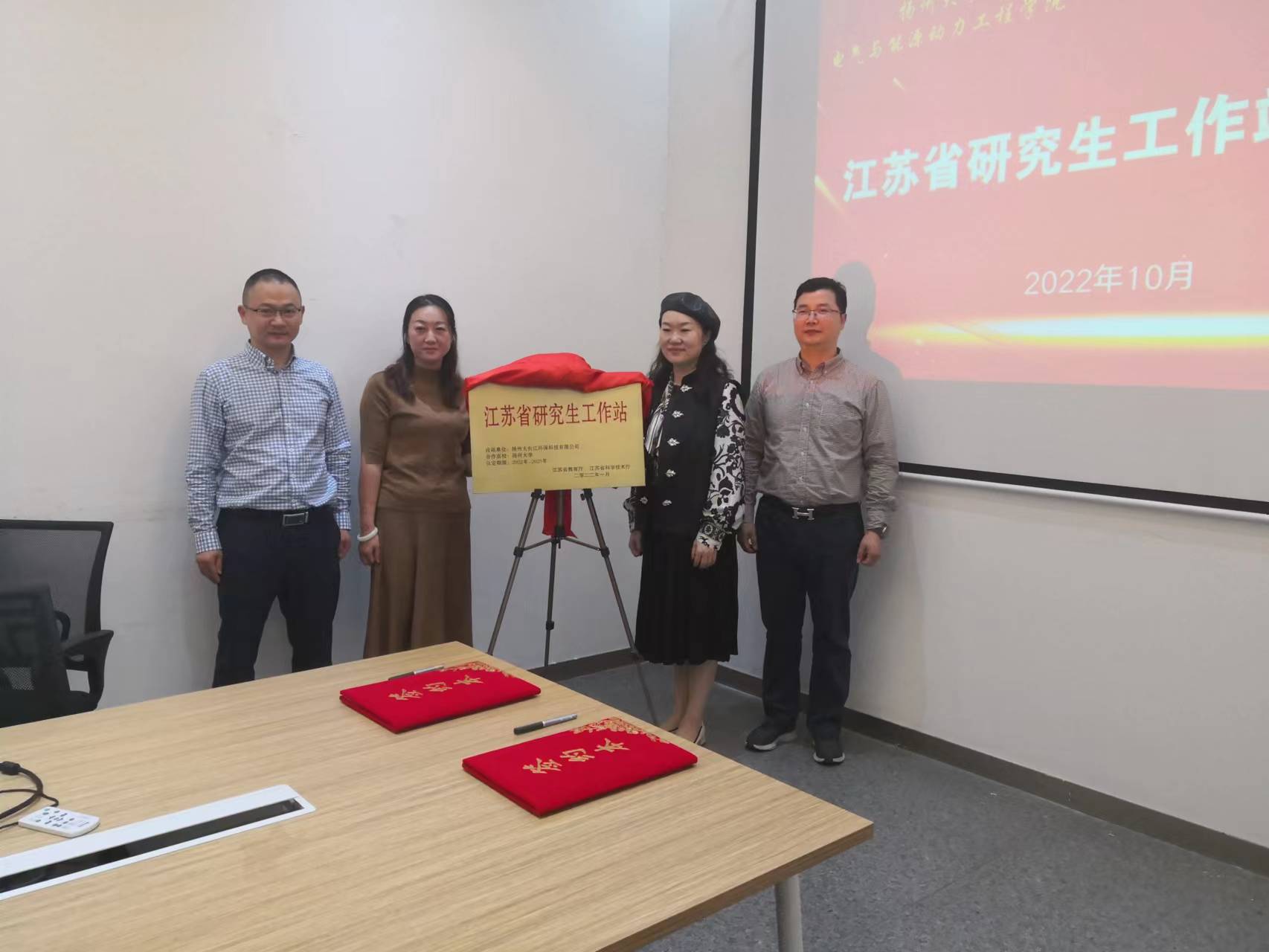 接着,由扬州大学研究生院王院长、扬州大学电气与能源动力工程学院张院长、扬州大长江环保张总、季总共同为江苏省研究生工作站揭牌。这一块沉甸甸的铜牌,对于大长江环保全体人员来说是压力更是动力。